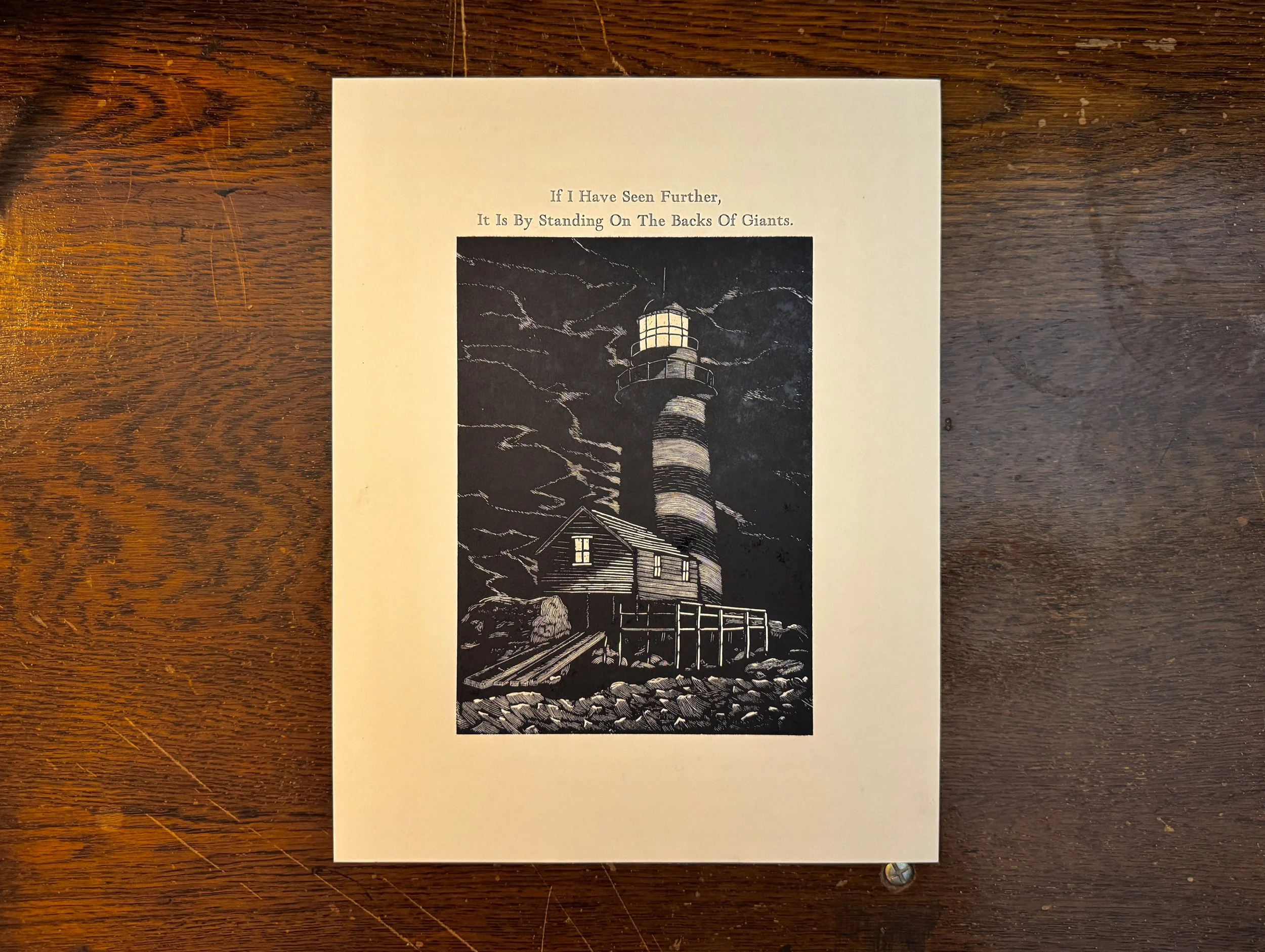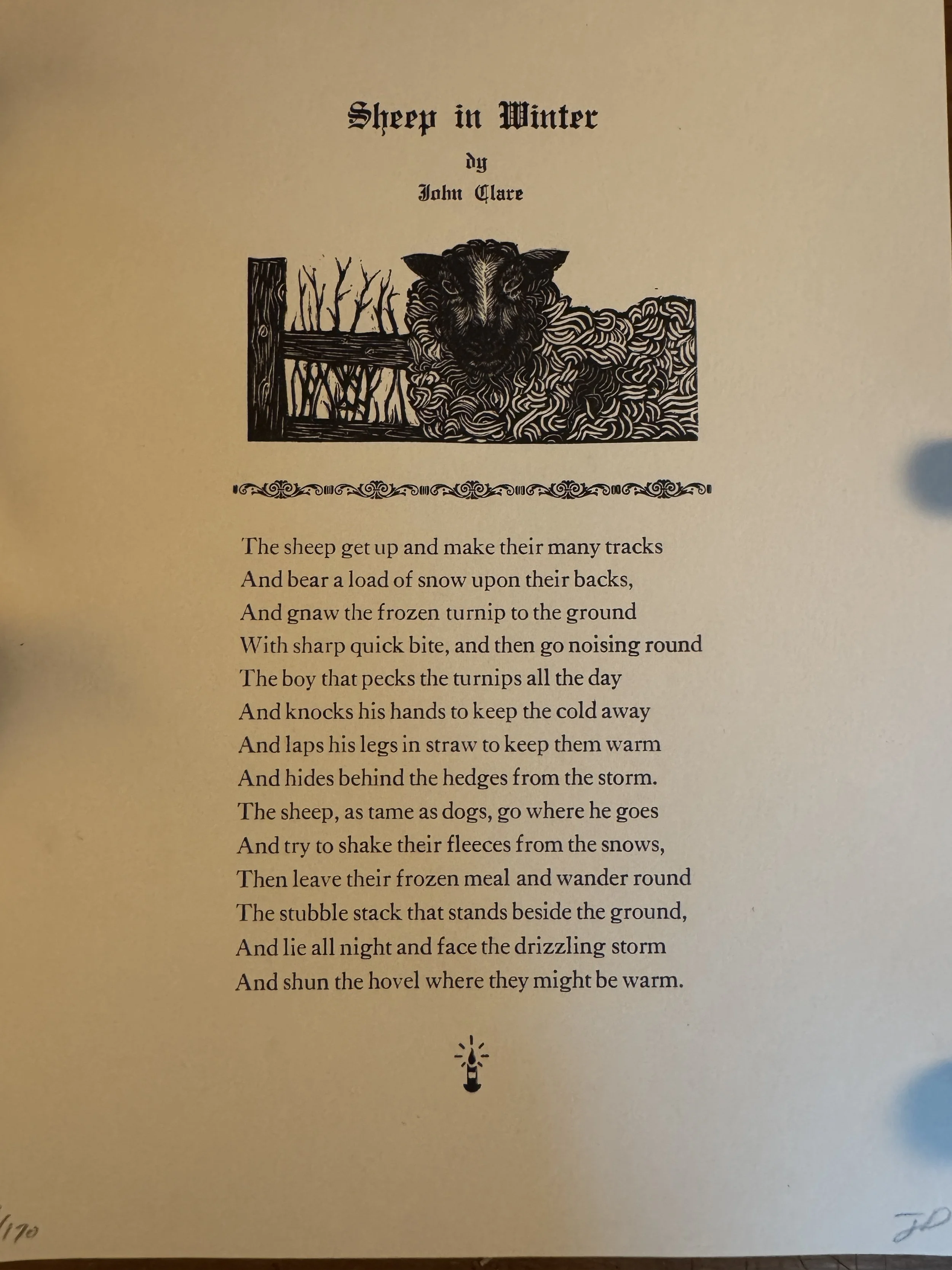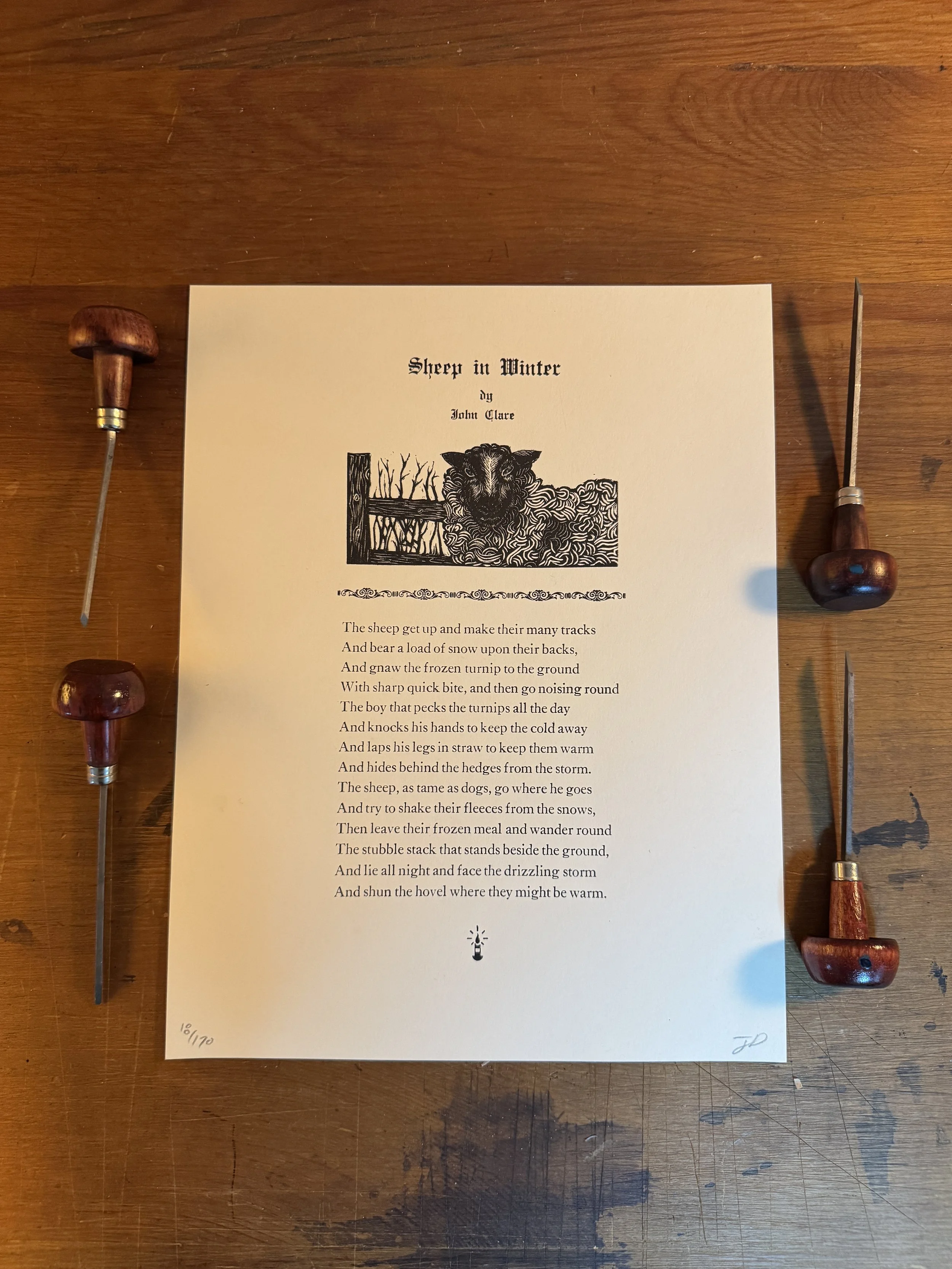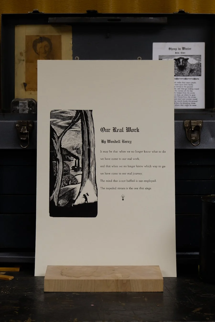 Prints John Clare's "Sheep in Winter" $20.00 Business Cards $0.00 "Backs of Giants" $30.00 Wedding Invitations $0.00 "Our Real Work" by Wendell Berry - Broadside $30.00 "The Vineyard" by Jens Hansen Broadside $20.00 "Serenity Prayer" Broadside $15.00 "By & By Lord By & By" Woodcut Print $110.00 "Warm Hearths" Card $11.00 "First Fields Path" $40.00 "Ole Faithful" Print $45.00 “Susan’s Gone” Woodcut Print $60.00 "Olde Tyme Mem'ry" Print $50.00 "Olde Summer Reckoning" Print $40.00 "Castenea Dentata" Print $35.00 "Castenea Dentata" Chattery Print $35.00 "Dirigo" T-shirt Print $40.00 "Dirigo" L.L Bean Barn Coat XL $80.00 "Dirigo" Print on Sweater $30.00